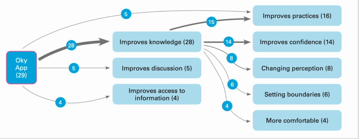 The example map below shows where the girls interviewed reported that Oky had contributed to their knowledge on menstrual care and SRHR. This knowledge then supported them to manage their periods, increased their confidence, and openness.